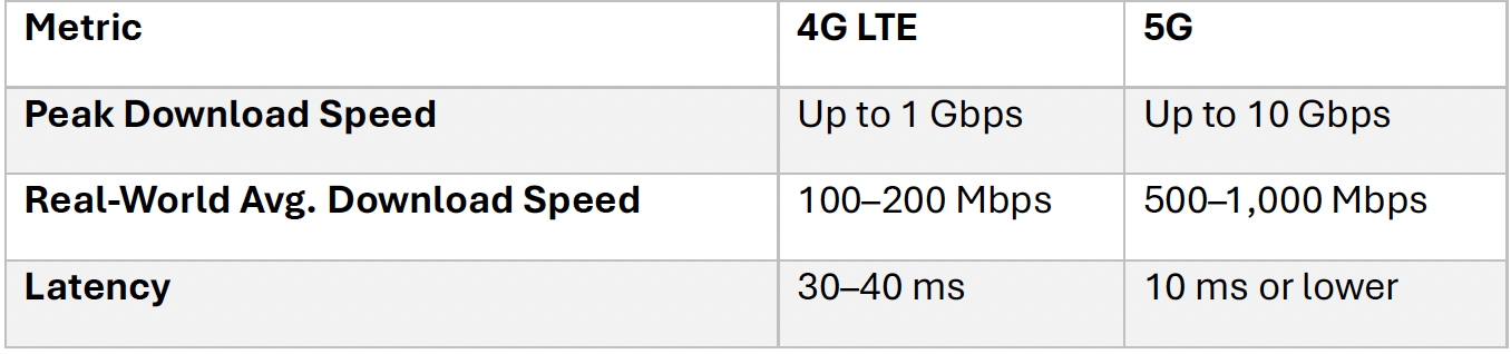 Figure 2: 4G LTE vs 5G Peak and Average Download Speeds.