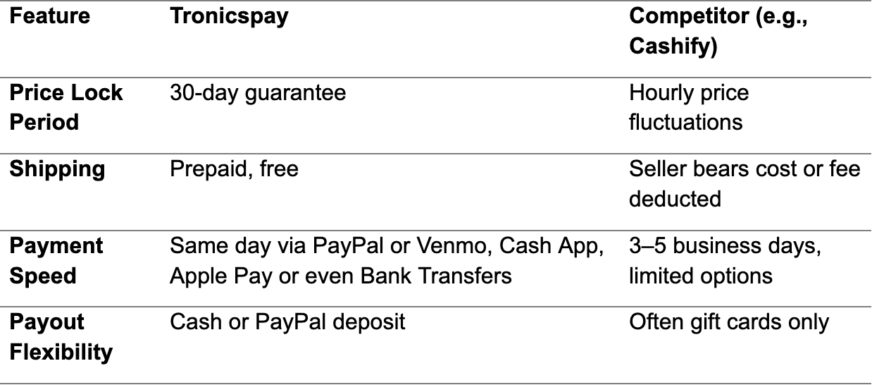 The evolution between 4G LTE and 5G technology brings fundamental changes to the way people can earn money by trading their used hardware. The 30-day price lock featured by Tronicspay's best trade-in service model protects users from wild market fluctuations, but Cashify's and other services adjust their offers hourly. The prepaid label enables free shipping without unexpected costs that reduce your payment amounts. After your device passes inspection, the payment arrives immediately through PayPal or Venmo, Cash App, Apple Pay or even Bank Transfers without requiring gift cards and without waiting weeks.